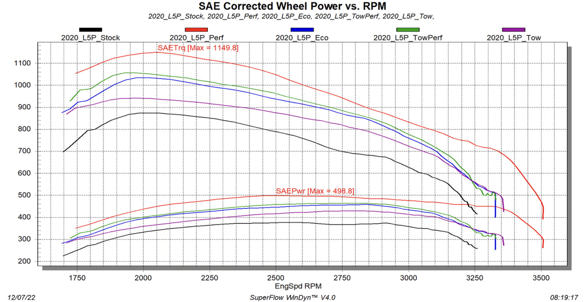 - Economy (50hp/100tq), Towing (75hp/160tq), Performance (90hp/180tq), Extreme (125hp/275tq) *Peak RPM Gains