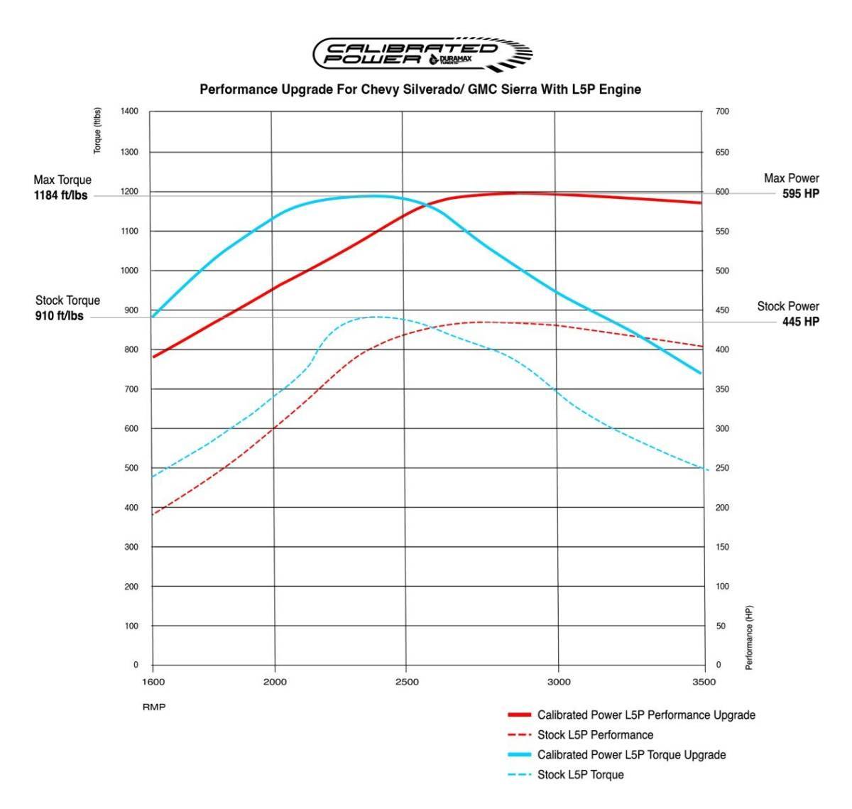 While the rated output for the L5P is 445 HP and 910 ft-lbs of torque it dyno'd 405 Rear Wheel Horsepower (RWHP) and 850 ft-lbs on Calibrated's loaded chassis dyno. This is an improvement from previous models but pales in comparison to the +150 RWHP you'll have access to with custom performance tuning.