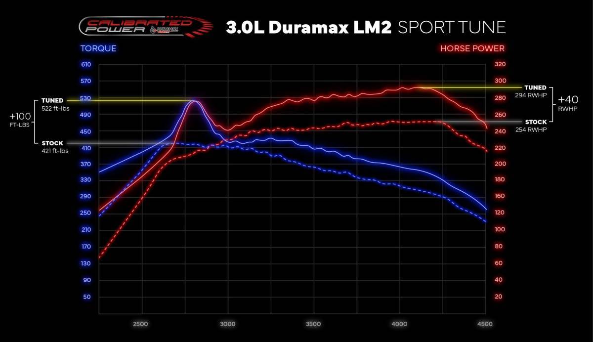 - Add up to +40 RWHP & +100 lb/ft TQ to your 3.0L LM2 Duramax