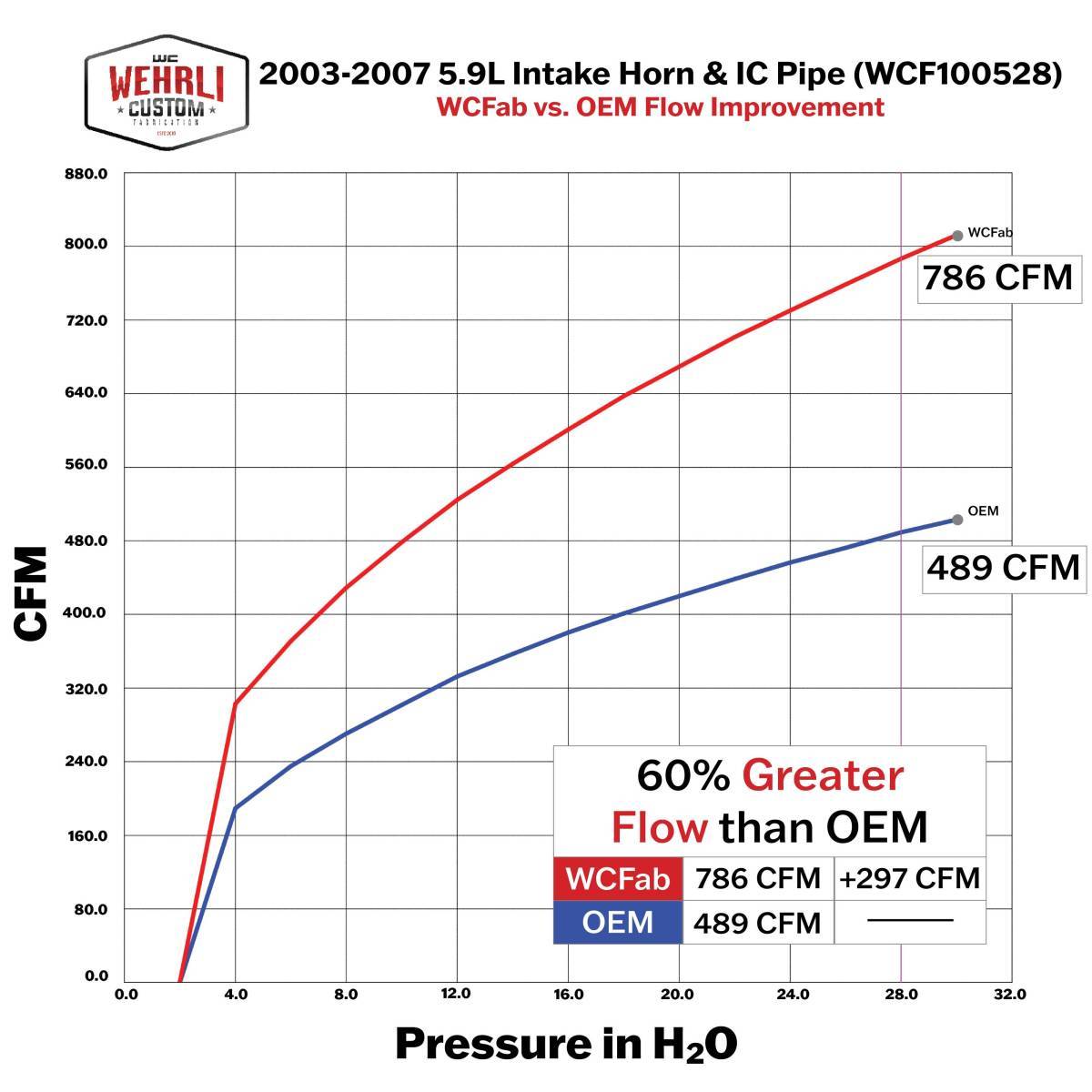 2003-2007 5.9L Cummins High Flow 3.5” Intake Horn and Driver Side Intercooler Pipe Kit. Kit replaces the failure prone 3” plastic OEM intercooler pipe with a 3.5” heavy duty 14g Aluminum intercooler pipe and the OEM cast intake horn (which is necked down to less than 1.5” wide) with a full mandrel bent 3.5” elbow. The 3.5” elbow is welded to a CNC machined aluminum mounting flange (new hardware included) which perfectly matches the WCFAB Intake Spacer Kit for optimum airflow into the cylinder head. Our horn can be used with the OEM grid heater or other brand high-flow intake plates; however, the internal surfaces may not be as perfect of a match as our Billet Intake Spacer kit offers. The CNC machined flange has two incorporated 1/8” pipe thread ports for boost reference or other injectables, and an 8mm threaded port to accept the wire harness isolation clamp to support the OEM wire harness. The 3.5” High Flow Horn also has an incorporated threaded bung to fasten the oil dipstick tube securely. Connecting the Intercooler pipe to the intercooler, and Pipe to Horn, are supplied high quality 5 ply silicone boots and stainless steel t-bolt clamps. No need to reuse any worn-out or torn OEM boots or clamps. The Intake horn and Intercooler Pipe are rounded off with WCFab's high-quality powder coat finish in your color of choice.