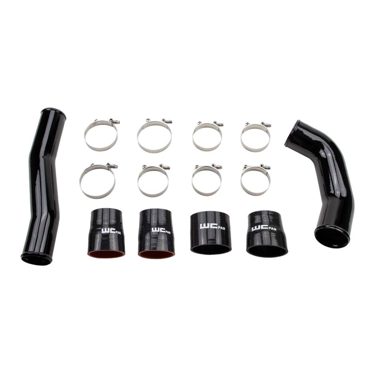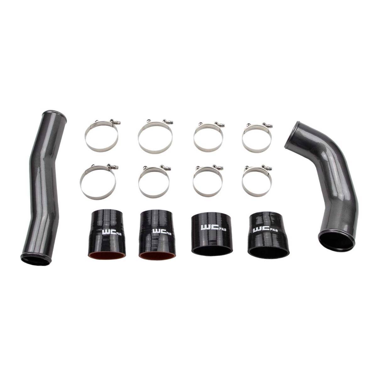 Replaces the poorly flowing, small diameter, crushed, factory pipes with our heavy duty, high flowing 3" Diameter Hot Side and 3.5” Diameter Cold Side Pipes. Kit includes upgraded high quality silicone boots that withstand higher pressure and temperatures than the factory boots to increase reliability and eliminate blown factory boots. Made in the USA from high strength, heavy duty 14 ga. aluminum tube with smooth, aerodynamic mandrel bends for increased durability and optimized flow.