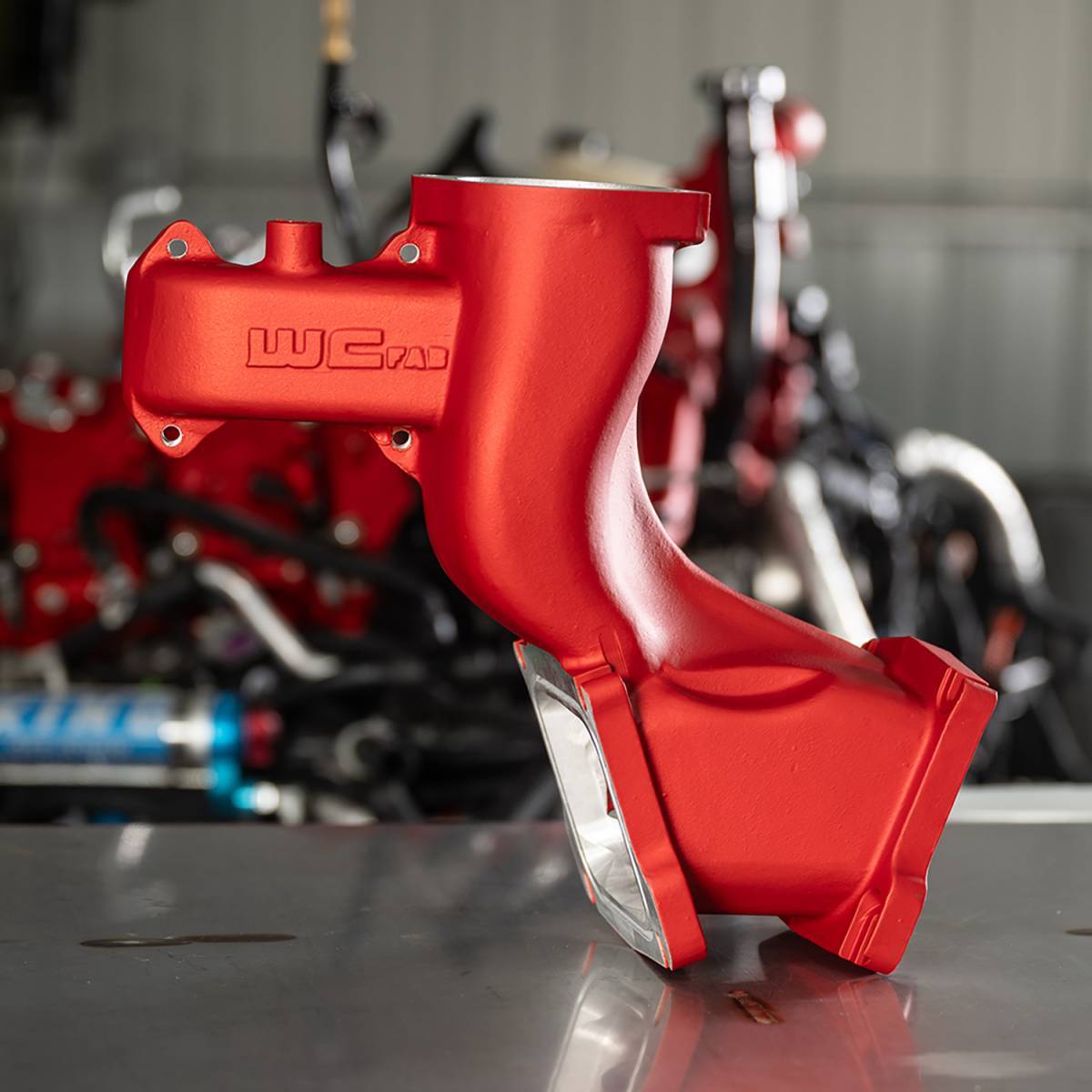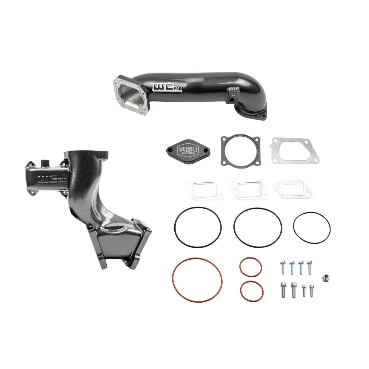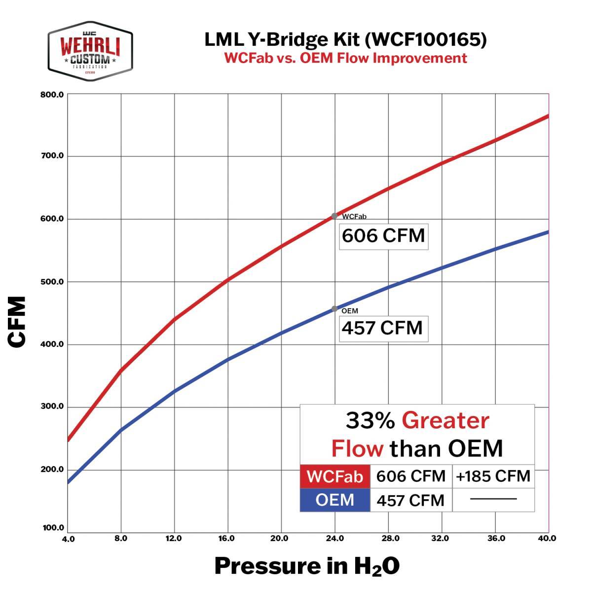 This LML Y-Bridge Kit is an upgraded high flow intake kit for the 2011-2016 6.6L Duramax diesel engine which replaces the OEM upper intake manifold supplying air to the engine intake runners and cylinder heads. The OEM Y-bridge for these trucks is a restrictive part that creates a bottle neck in the air intake tract and limits engine performance potential. This kit includes our high flow, precision CNC machined, cast aluminum precision intake bridge (40% more airflow than stock) together with a unique, 20% larger than stock, 3" fabricated aluminum upper crossover intercooler pipe that allows you to take full advantage of the larger inlet diameter of our y bridge. The combination improves total air flow by 33% over the stock setup using providing maximum airflow volume for the available space. This means you get the most out of your engine in terms of performance and efficiency. Incorporates factory intake air heater grid for superior cold weather performance. Billet resonator plate eliminates the stock plastic resonator for improved engine bay appearance and more aggressive turbo and engine sound. Compatible with OEM throttle valve, EGR controls, and lower passenger side Intercooler Pipe. Add WCFab 3.5" High Flow Intercooler Pipe WCF100682 to get the most out of this kit and eliminate the failure prone plastic cold side charge pipe.