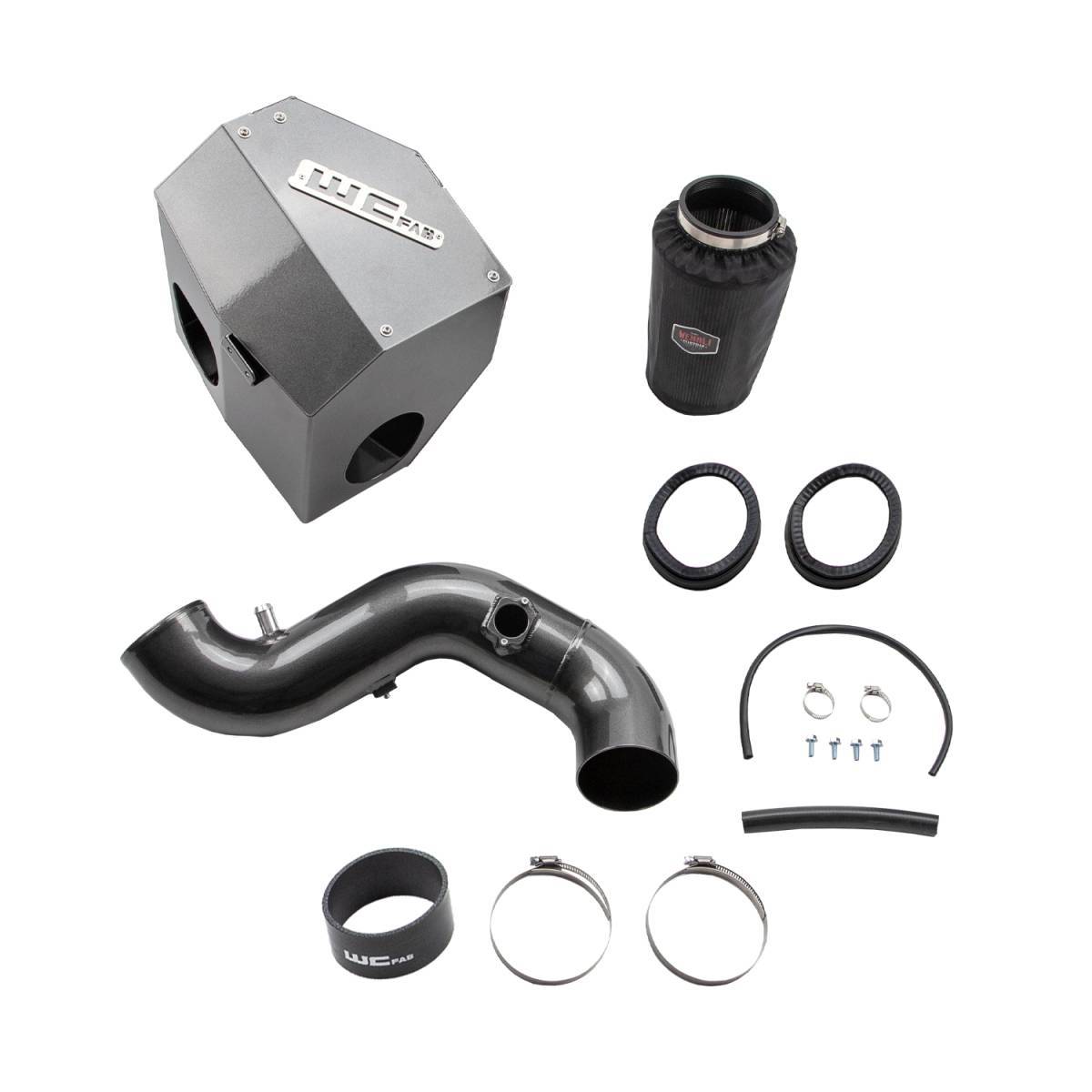High quality hardware, silicone boot, seals, and stainless steel t-bolt clamps ensure optimum durability and ease of installation. Removable air box lid element allows for easy visual inspection and maintenance of your WCFab filter with included hydrophobic pre-filter cover, to help keep your MAF sensor, turbo, and engine airways contaminant free. Air box provides mounting provision for the OEM air box actuator so that it can remain plugged in for CEL free operation, but keeps both grille and fender ports fully open for maximum air flow to your turbo.