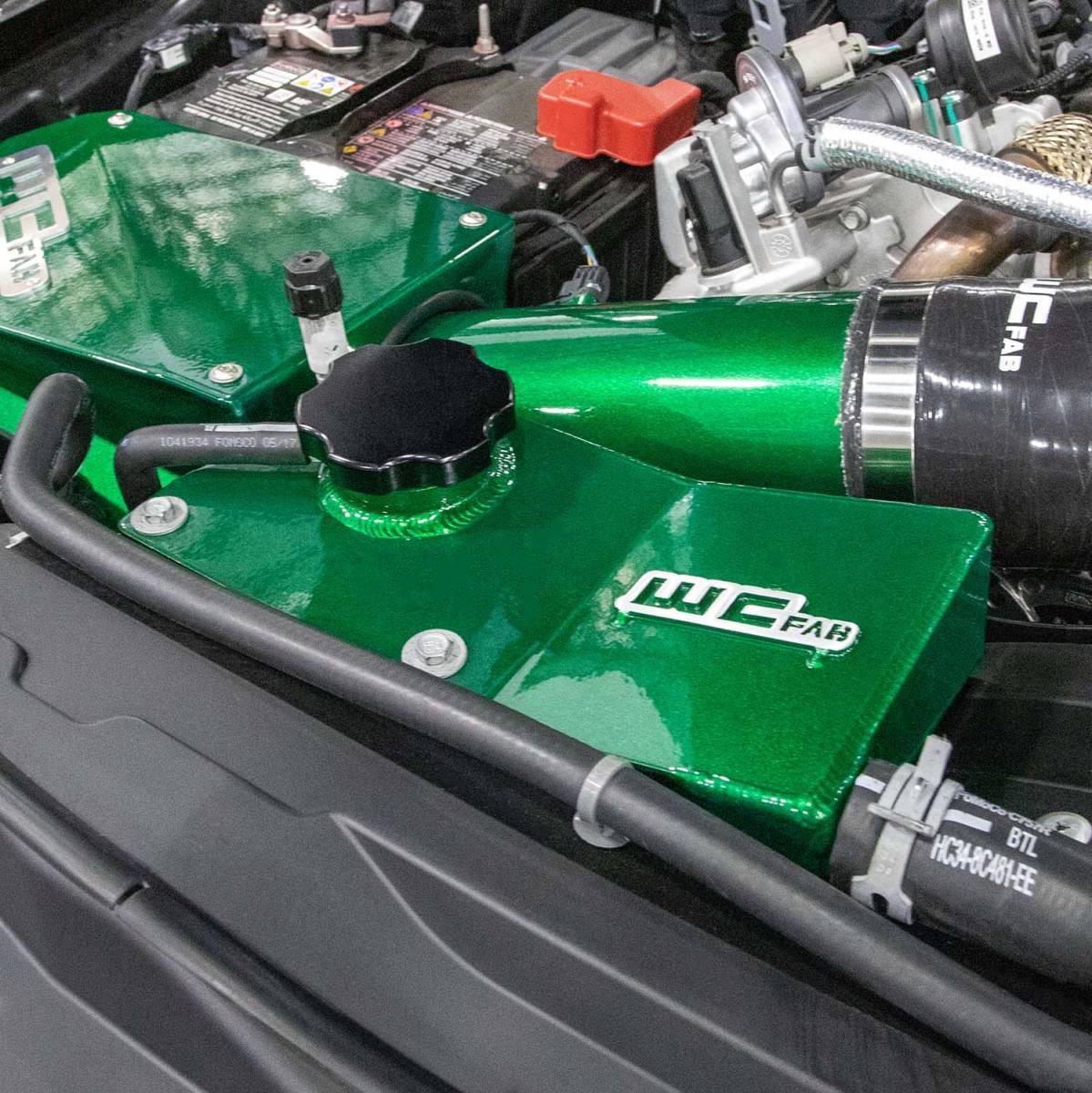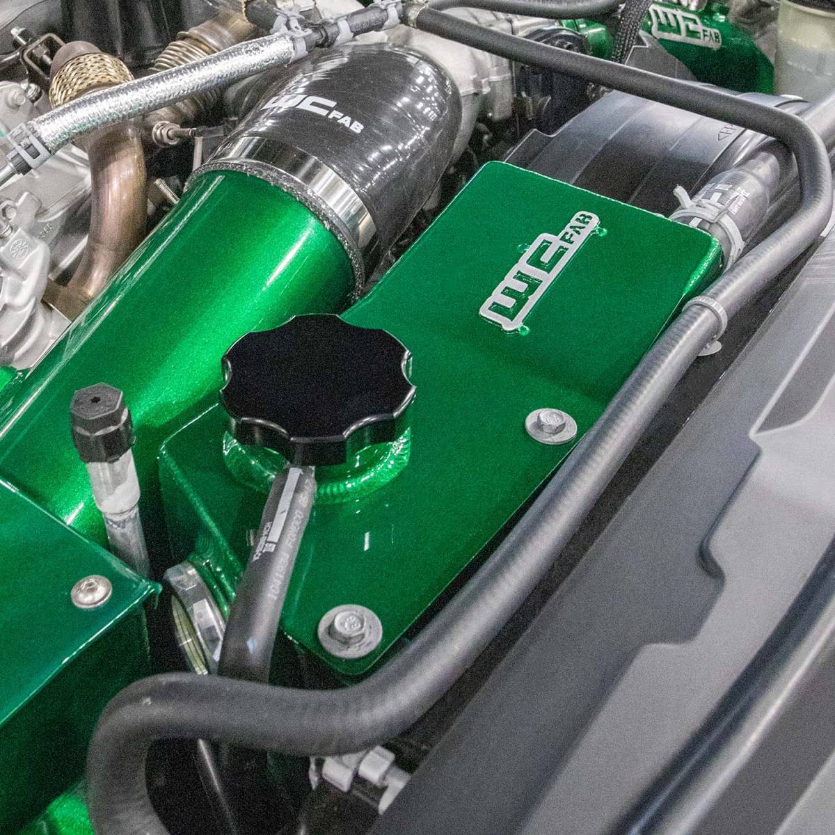 The WCFab Secondary Coolant Tank Kit for the 2017-2025 Ford Super Duty equipped with the 6.7L Power Stroke Diesel engine replaces the ugly OEM plastic reservoir on the passenger side front of the engine bay, and is a great way to dress up under the hood of your truck. This fabricated aluminum coolant reservoir mounts in the OEM location and retains necessary connections for all factory hoses. Includes billet aluminum sight glass and black anodized coolant cap.