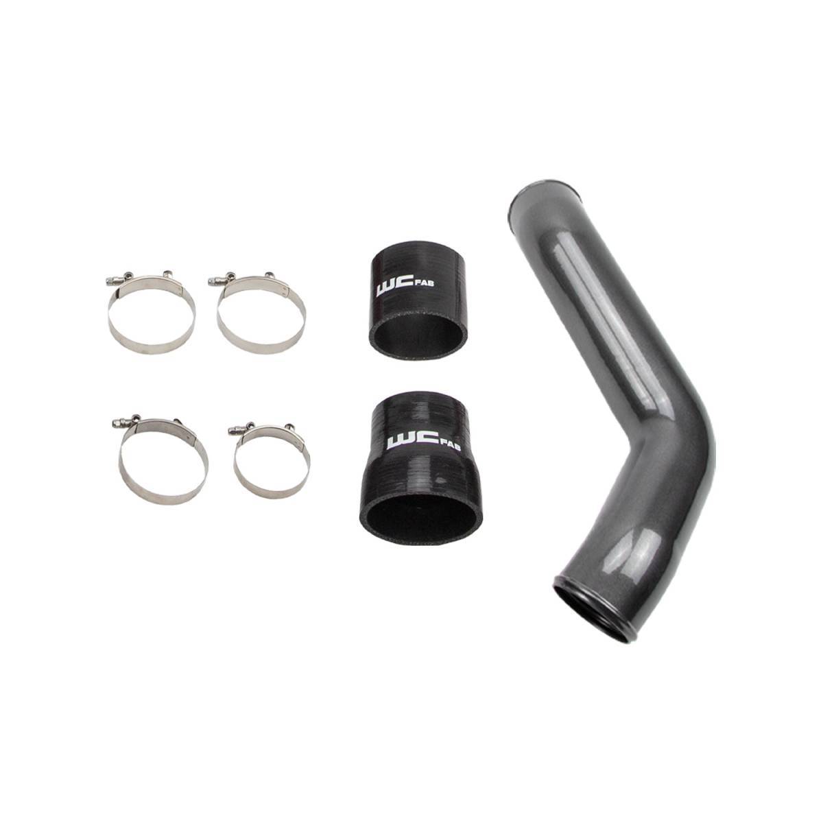 Replaces the poorly flowing, small diameter, crushed factory pipe with our heavy duty, high flowing 3.5-inch diameter Pipe. The WCFab kit includes upgraded high-quality silicone straight boots that withstand higher pressure and temperatures than the OEM parts to increase reliability and eliminate blown factory boots. Made in the USA from high strength, heavy duty 14 ga. Aluminum tube with smooth, aerodynamic mandrel bends for increased durability and optimized flow.