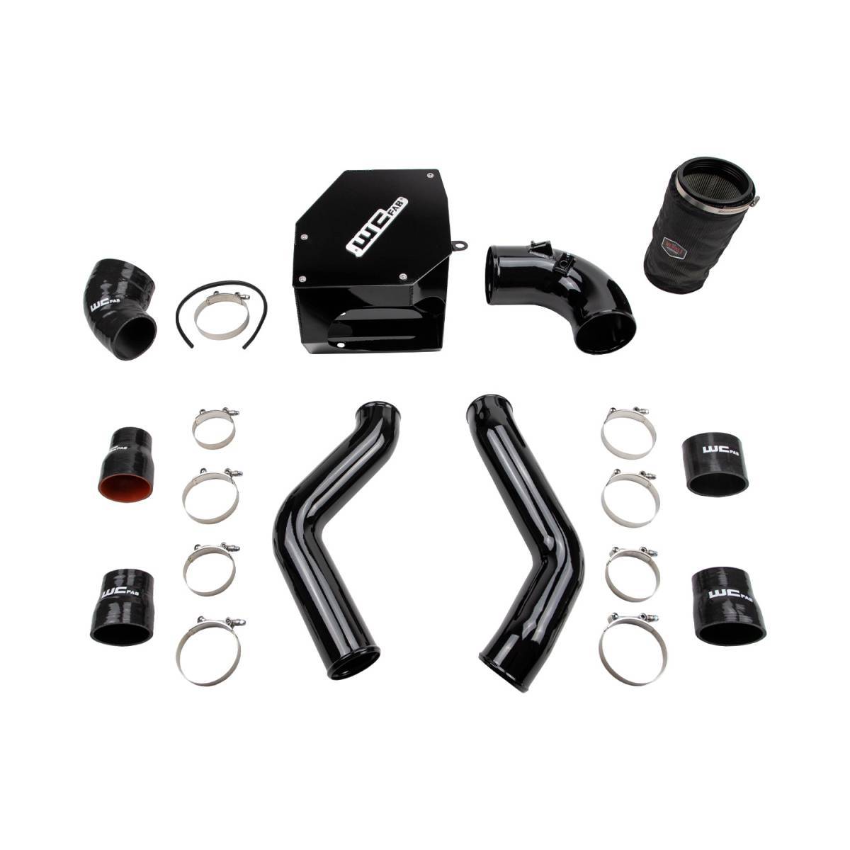 Replaces the poorly flowing, small diameter, crushed factory pipes with our heavy duty, high flowing 3.5-inch diameter Pipes. The stock passenger / hot side pipe is only 2.75 inches in diameter and a significant restriction in the intercooler system. The WCFab kit includes upgraded high-quality silicone straight boots that withstand higher pressure and temperatures than the OEM parts to increase reliability and eliminate blown factory boots. Made in the USA from high strength, heavy duty 14 ga. Aluminum tube with smooth, aerodynamic mandrel bends for increased durability and optimized flow.