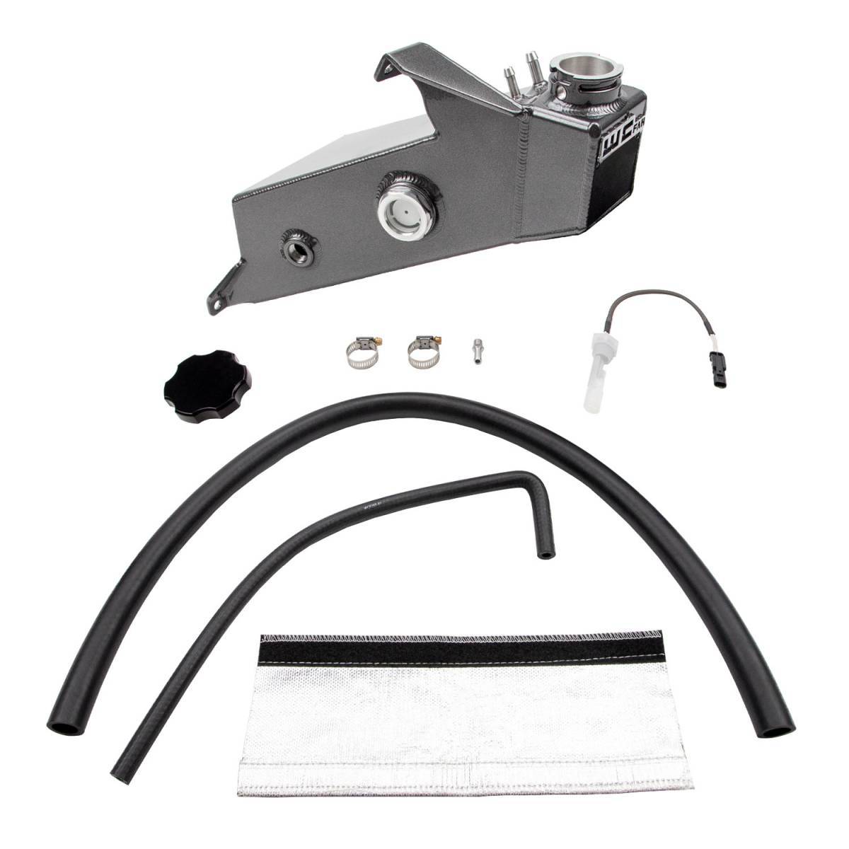 Compatible with stock / drop-in turbo setups. Low profile design eliminates engine side bracket found on stock plastic tanks and offers significantly improved clearance for lower front edge of tank assembly vs. stock allowing for better compatibility with aftermarket turbo setups.