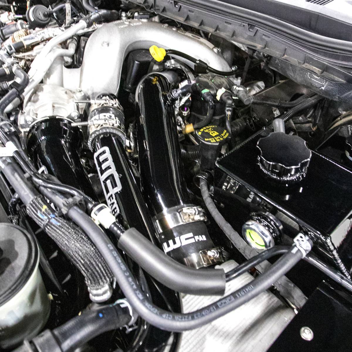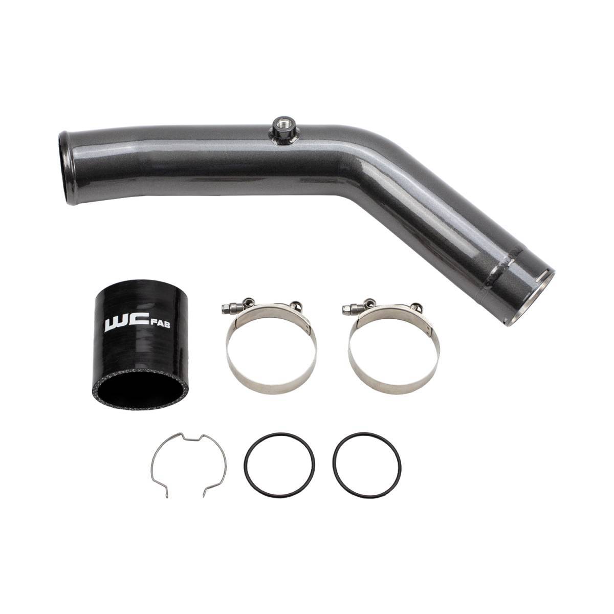 This 3" High Flow Driver Side Intercooler pipe from WCFab for the 2023-2024 Ford Super Duty High Output equipped with the 6.7L Power Stroke diesel replaces the OEM restrictive 2.5" design with a fabricated aluminum high flow 3" pipe. Includes upgraded silicone boot to withstand higher pressure and temperature than the factory for increased reliability and eliminates blown factory boots. Includes bung on pipe for temperature sensor. CNC Machined billet aluminum flange with double o-ring seal for superior performance and reduced potential for horsepower-robbing boost leaks.